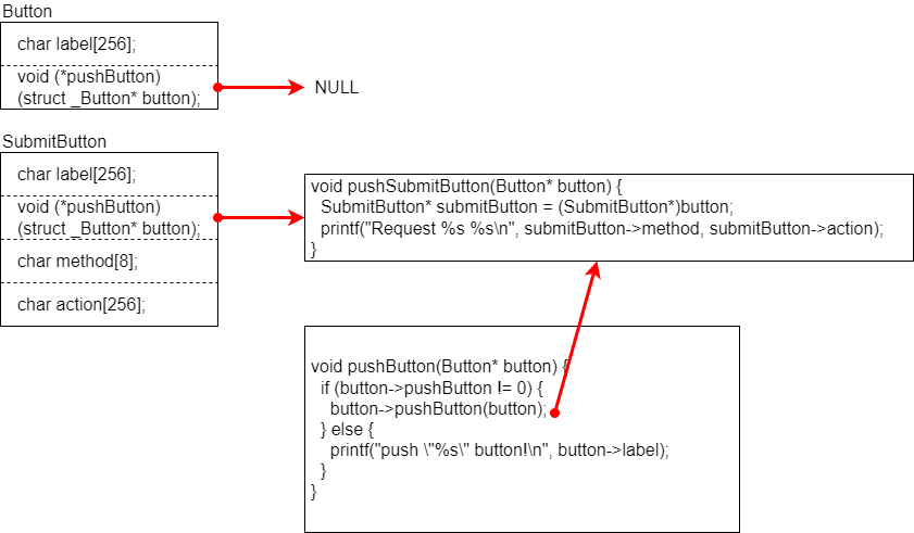 Button->pushButtonはNULLを指すようにします。そして、SubmitButton->button.pushButtonはpushSubmitButton関数を指すようにします。あとは、pushButton関数で関数ポインタpushButtonがNULLの場合は従来の処理を、NULL以外の場合は関数ポインタpushButtonの処理を呼び出すことでオーバーライドが実現できます。