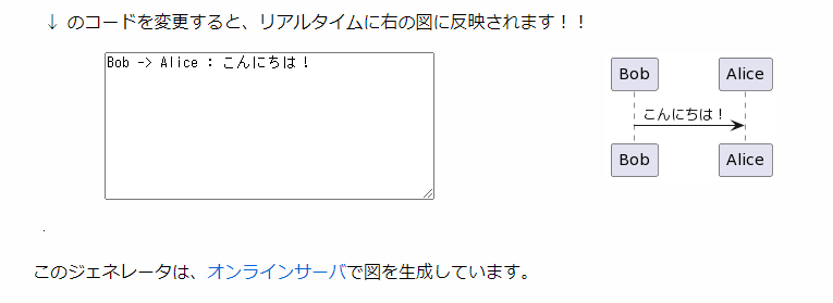 公式サイトの最下部に、PlantUMLをお手軽に試せるテキストエリアがありますので、そちらで自由に試すことが出来ます。