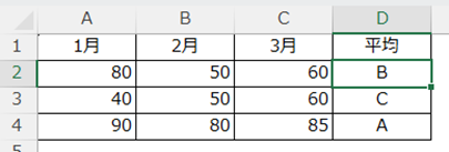 下記のような表があり、1月~3月の平均を40以下⇒D、50以下⇒C、70以下⇒B、71以上⇒Aで分類する計算式を考えてみましょう。