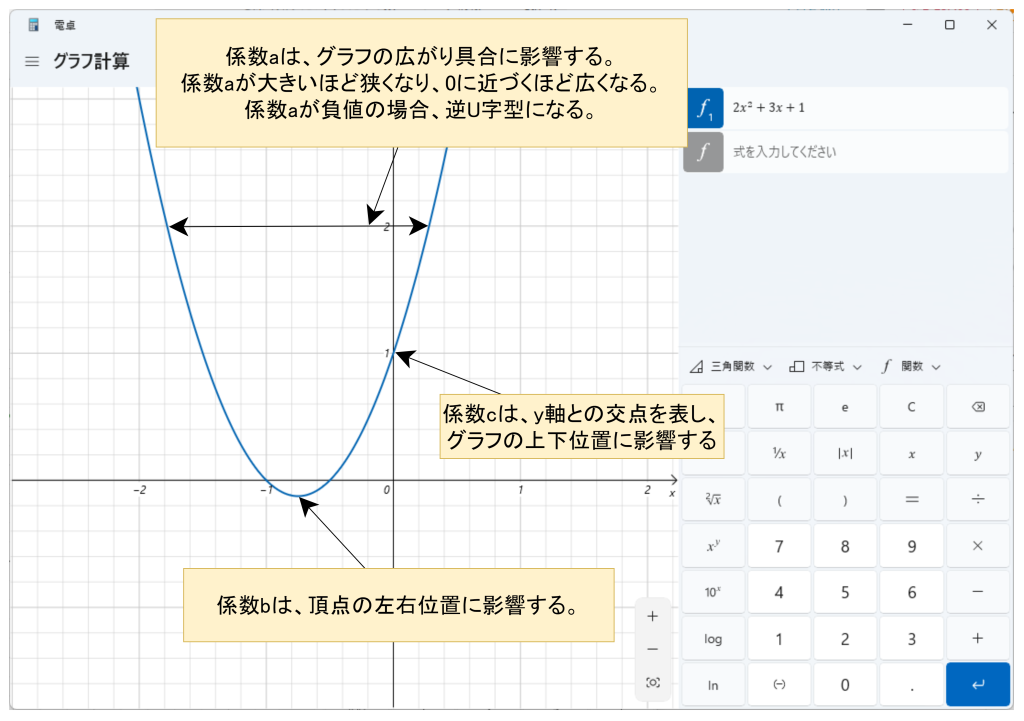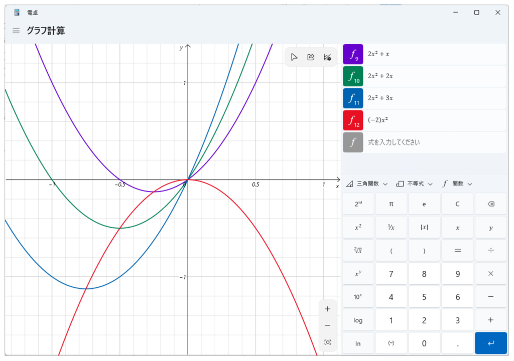 ちなみにWindows付属の電卓では、今回添付した画像の通りグラフを描くことができます。結構便利で、ネイピア数を使った曲線も描けるのでお勧めです。