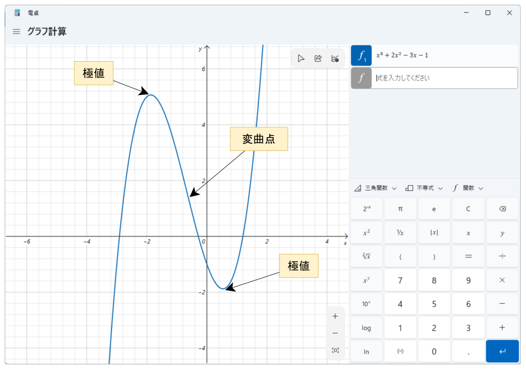 3次関数をグラフで表現するとS字曲線になります。その際、山と谷のそれぞれを極値といい、凸型から凹型に切り替わる点を変曲点と言います。