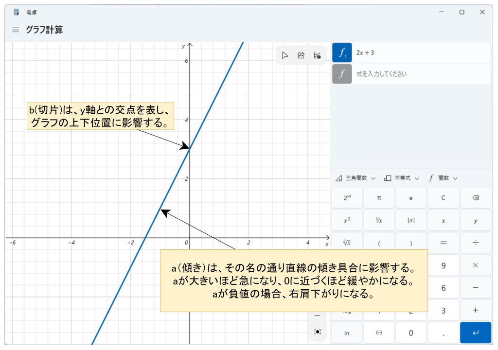 1次関数をグラフで表現すると直線になります。その際、a:傾きは直線の傾きを、b:切片は直線とy軸が交差する位置に影響を与えます。
