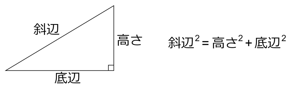 三平方の定理とは、直角三角形の3辺の長さに関する関係を表す定理です。具体的には、直角三角形の3辺は、斜辺2=高さ2+底辺2の関係になります。