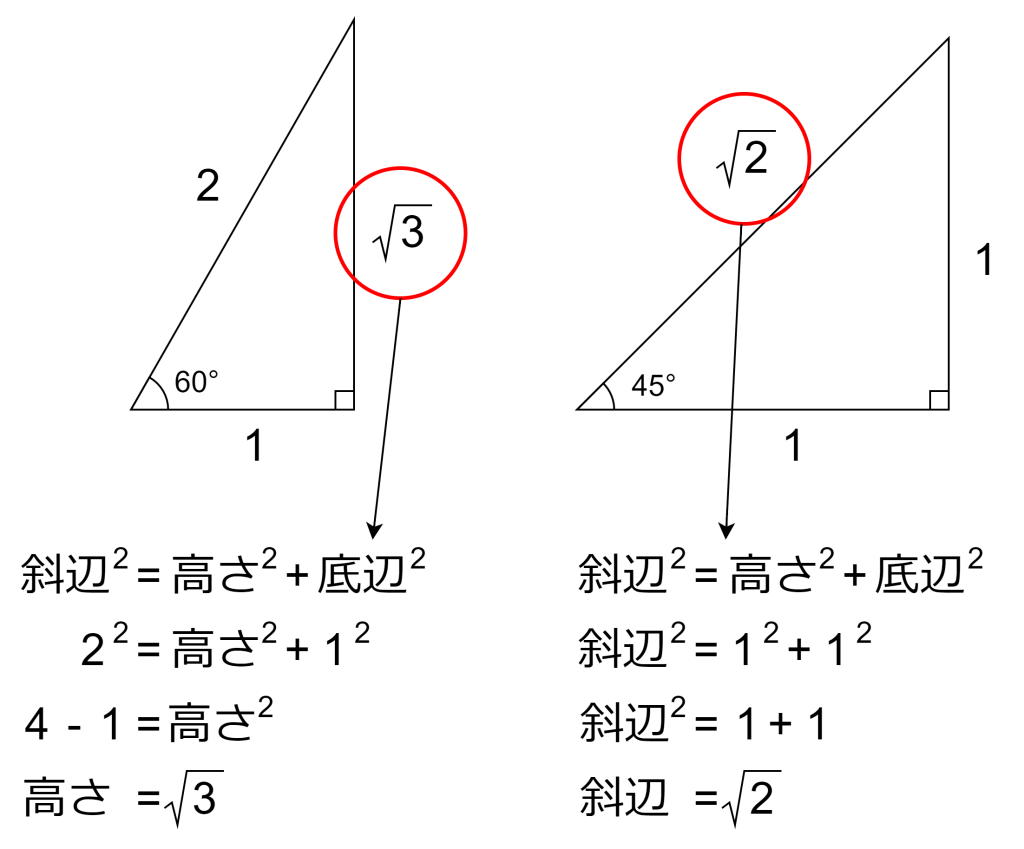 この定理を使うと、45°の直角三角形と、60°の直角三角形のそれぞれの辺の長さは以下の関係になります。