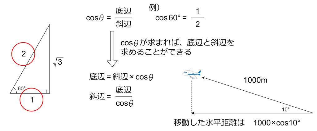 cosΘは斜辺と底辺の比率を表します。60°の直角三角形であれば、cos 60° = 1 / 2 になります。cosΘが分かれば、底辺と斜辺を求めることができます。先ほどの飛行機の例で言えば、上昇角度が10°で1000m進んだ場合、実際に移動した距離は1000×cos10°であり、おおよそ985m移動したことが分かります。