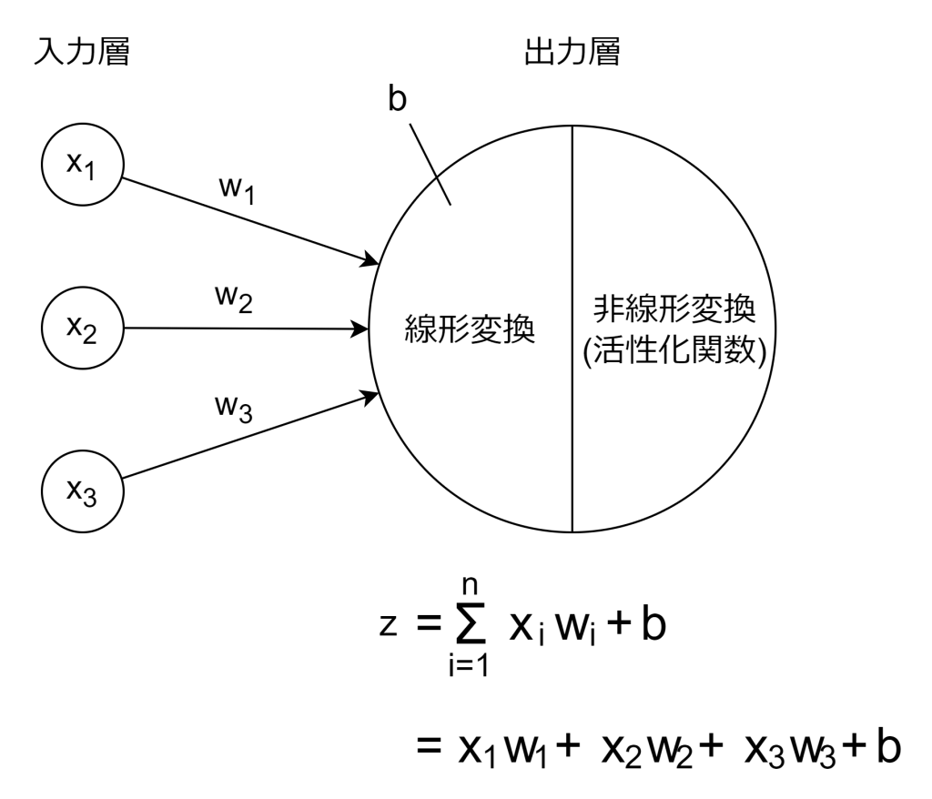 また、ニューラルネットワークの線形変換においても総和が使われます。各ニューロンが複数の入力を受け取り、それぞれに重みをかけて合計する処理は、まさに総和です。nはインプットとなるニューロンの数です。