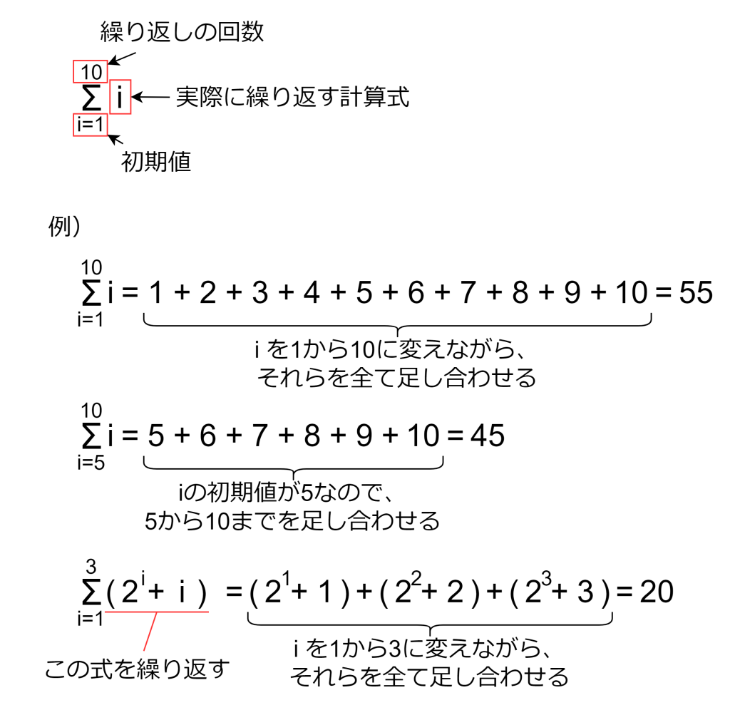 Σの下は初期値を表しており、上は繰り返しの回数を表しています。つまりは、i を1から10まで変化させながら、その全てを足し合わせる、という意味になります。