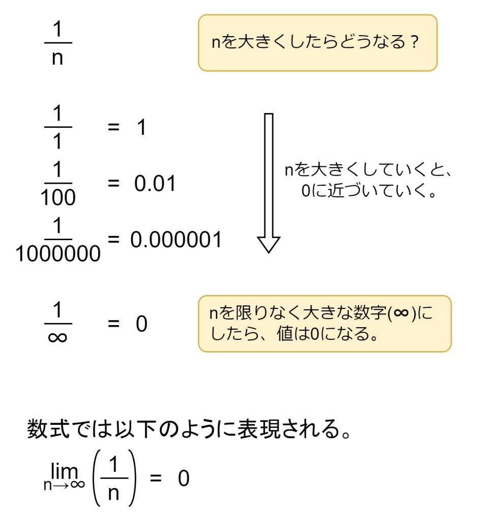 極限は「値や入力がある点に近づくとき、出力がどこに落ち着くか」を表現する道具です。例えば1/nがあるとします。このnを限りなく大きな数字となったらどうなると思いますか?n=1であれば、1/1=1になります。n=100であれば、1/100=0.01と小さくなります。n=1,000,000であれば、1/1,000,000 = 0.000001と更に小さくなります。では、n=∞の場合はどうなるのでしょう?無限は果てしなく大きな数字です。1/∞は0になることでしょう。