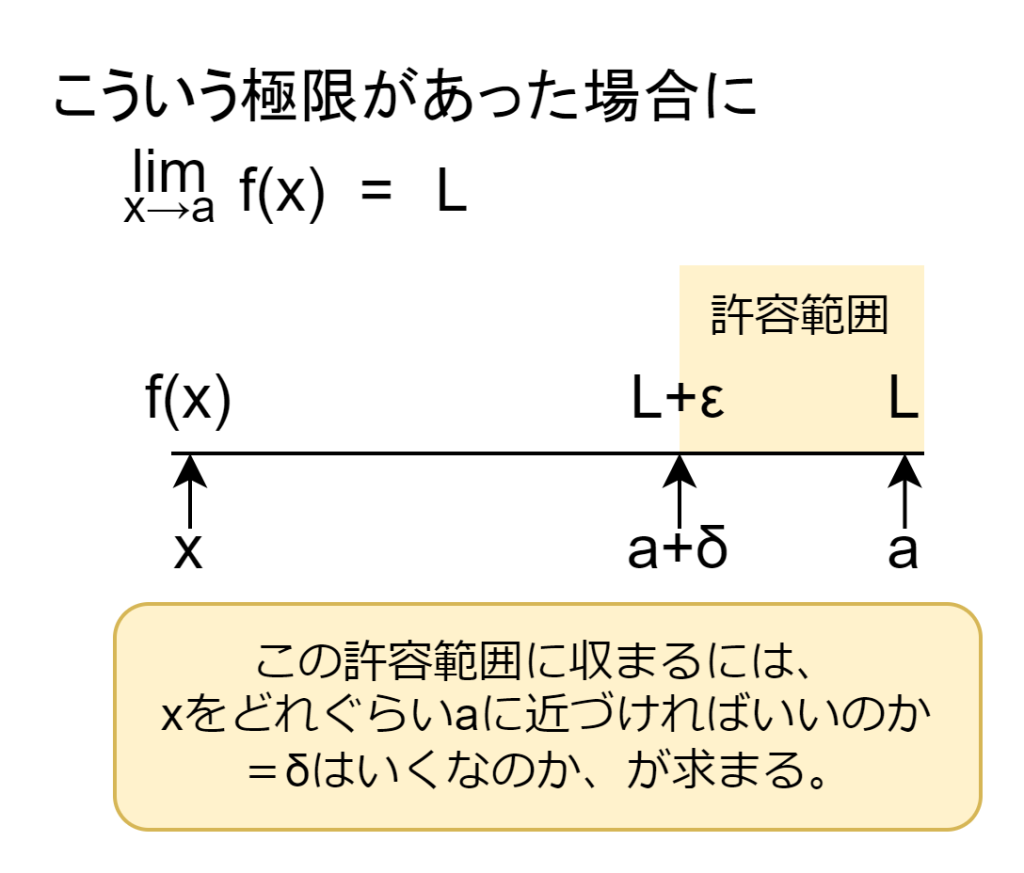 ε (イプシロン)とは、ゴールの近さを表す「許容誤差」です。例えば極限値Lが2となる場合、その2にどれだけ近づけば許容するのかを定めます。δ(デルタ)とは、入力の近さを表す「どれくらい a に近づけばいいか」です。結果をε以内に収めたい場合、どれぐらい x を a に近づけばいいのかの指標になります。