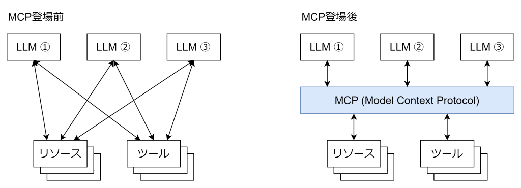 MCPはそんな問題を解決するプロトコルになります。生成AIと外部リソースやツールとの間で決まり事を設けることにより、生成AIを提供するサービス側は追加で開発する必要がなくなり、開発をコストを下げながらも柔軟に外部システムとの接続を可能とします。