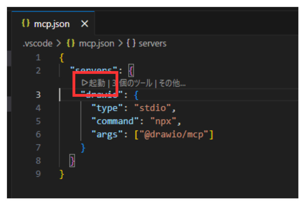まず、プロジェクトのルートに.vscodeフォルダを作成します。その.vscodeフォルダ配下に、mcp.jsonファイルを作成します。.vscodeファイルには利用するMCPサーバーを指定します。以下はDraw.ioのMCPサーバーを定義しています。